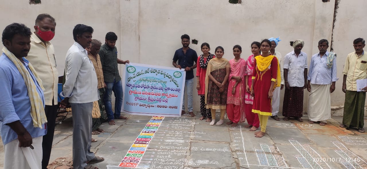 In SKCHS, 2016 batch students were the first batch to be sent for RHWEP programme which started from 6th August 2019 and ended on 15th November 2019. It started with half of the girl students and half of the boy students out of total class divided into three groups are attached to HRS Rekulakunta Anantapur, and HRS Mahanandi were sent to NEELAMPALLI and KORRAPADU villages of Anantapur District and Gopavaram village of Nandyal District respectively. They conducted RHWE programme as guided with the help of selected host farmers and HRS Scientists. This programme consists of various Production activities - study of crops by visiting field directly and actively involving in all the cultural operations along with the farmers; Protection Activities – Directly observing various diseases and pests attacking different crops in the village and their practical management followed by farmers compared with what is recommended; Economic Activities – Includes conducting Village Economic Survey, Family Budget of different types of farmers, Socio – economic situation of the village ; Extension Activities – Method & Result Demonstrations, Group Discussion, Rythu exhibition to help farmers aware of the new technology, varieties, skills developed recently which can make them profitable. Second batch of girl students were sent to Hampapuram and Gandlaparthy villages of Anantapur District and Gajulapalle village of Kurnool district for remaining boys batch which started on 21st December 2019 and ended on 16th march 2020.